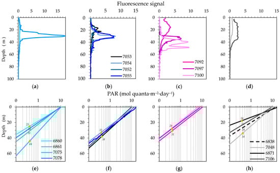 Vertical profiles of fluorescence signal and daily PAR (mol quanta∙m−2∙day−1) in the five areas: Nansen Basin (a,e), Greenland Sea (b,f), Barents Sea (c,g), and the southern areas of the Norwegian and Barents Seas (d,h). There are no fluorescence signal data from sts. 6838, 6860, 6861 and 6871 as the fluorimeter was broken in 2020. The red dots denote the depth of the compensation PAR value.
