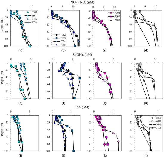 Vertical profiles of the sum of nitrate and nitrite nitrogen, dissolved silicate and dissolved inorganic phosphorus (µM) in the five sampling areas: Nansen Basin (a,e,i), Greenland Sea (b,f,j), Barents Sea (c,g,k), and the southern areas of the Norwegian and Barents Seas (d,h,l).