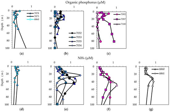 Vertical profiles of dark bicarbonate fixation (mg·m−3·d−1), dissolved organic phosphorus and ammonium nitrogen (µM), the share of pheophytin in the total concentration of chlorophyll a and pheophytin (%) in the five areas: Nansen Basin (a,d), Greenland Sea (b,e), Barents Sea (c,f), and the southern areas of the Norwegian and Barents Seas (g).