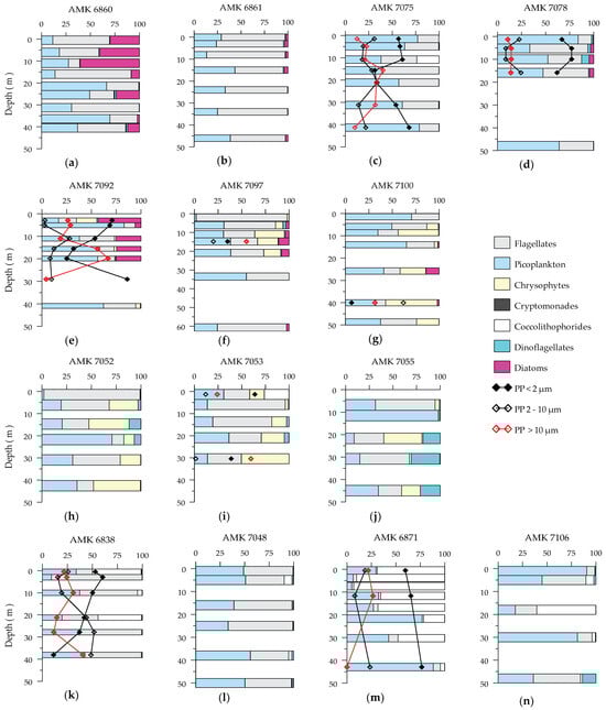 Phytoplankton abundance (%) and primary production by various phytoplankton size groups (%) in the Nansen Basin (a–d), the northern (e–g) and southern parts of the Barents Sea (m,n) and the Greenland (h–j) and Norwegian Seas (k,l). Taxonomy information is absent for st. 7054, as sampling was not performed; thus, data on size-fractioned primary production for this station was compared with taxonomy information for st. 7053, which was the most similar one for most other parameters.