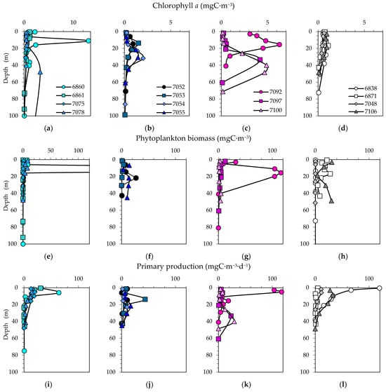 Vertical profiles of chlorophyll a concentration (mgC·m−3), phytoplankton biomass (mgC·m−3) and primary production (mgC·m−3·d−1) in the sampling locations: Nansen Basin (a,e,i), Greenland Sea (b,f,j), Barents Sea (c,g,k), and southern areas of Norwegian and Barents Seas (d,h,l).