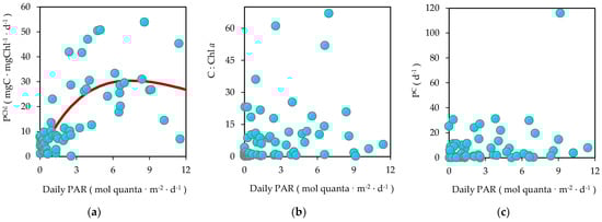 Finally, the different ecology of species largely explains the wide range of light levels that are optimal for photosynthesis in phytoplankton < 2 μm in size, which we revealed by fitting field measurements to the theoretical model. It can be assumed that the low threshold of photosynthetic light saturation is related to diatoms (1.2 mol quanta·m−2·d−1), which, like the large species, contributed to the formation of the deep Chl a maximum at the base of the Zeu. In contrast, the lack of photoinhibition at PAR > 5.6 mol quanta·m−2·d−1 obtained for phytoplankton > 10 µm in size was associated with a change in the composition of the community of small cells and the occurrence of species inhabiting environments with high light intensities, such as the unicellular green algae Micromonas (group Mamiellophyceae) or Arctic endemic cyanobacteria [19,21,84,85]. It has recently been shown that these algae can be adapted to a variety of ecological niches [86].
