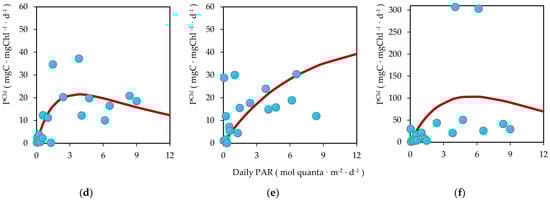 Relationship between PAR and chlorophyll-a-specific primary production (a), size-fractioned primary production of phytoplankton < 2 µm in size (d), phytoplankton 2–10 µm in size (e) and phytoplankton > 10 µm in size (f) in the marginal ice zone of the Nansen Basin and the Greenland and Barents Seas. Data were fitted to Platt and Gallegos hyperbola y = A(1 − e−αPAR/A/eβPAR/A), where A, α and β are the parameters of the model [47]. In (f), removing the two maximum values from the data set did not change the fit. No dependences for phytoplankton carbon biomass to chlorophyll a ratio (b) and biomass turnover rate (c) on PAR were obtained.