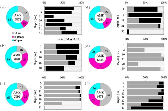 Percent distribution for the various fractions of the dark carbon fixation rate that were determined in the plankton < 2 μm in size (blue-colored section of diagram), plankton of 2–10 µm in size (pink-colored section) and plankton > 10 µm in size (grey-colored section) at the early-bloom (a) and peak-bloom (b) stages in the Nansen Basin and at the bloom stage in the northern Barents Sea (c), Greenland Sea (d), Norwegian Sea (e) and the coccolithophorides late-bloom stage in the southern part of the Barents Sea (f). Histograms show vertical variations in the percentage contribution to the phytoplankton biomass of autotrophic (A), heterotrophic (H) and mixotrophic (M) species and species of unknown trophic type (U).