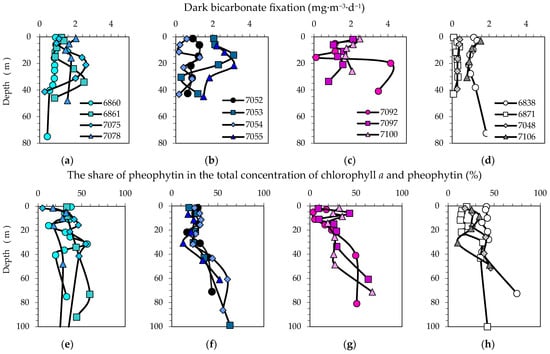 Vertical profiles of dark bicarbonate fixation (mg·m−3·d−1) and the share of pheophytin in the total concentration of chlorophyll a and pheophytin (%) in the five areas: Nansen Basin (a,e), Greenland Sea (b,f), Barents Sea (c,g), and the southern areas of Norwegian and Barents Seas (d,h).