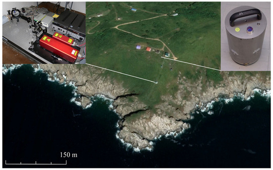To register deformation anomalies, we use a laser strainmeter due to its unique amplitude-frequency characteristics, which allow us to register the anomalies at almost any planetary distance. The laser strainmeter, the records of which were processed before preparation of this paper, is a part of the seismoacoustic and hydrophysical complex located on the territory of the International Scientific and Educational Site of the POI FEB RAS “Shultz Cape” [21], Figure 1. The instrument is installed at the point with coordinates 42°34.798′ N, 131°9.400′ E. It is based on an unequal-arm Michelson interferometer with a measuring arm length of 52.5 m, which is oriented at an angle of 18° to the North-South line. It uses a frequency-stabilized helium-neon laser by Melles Griott with a long-term stability of 10−9 as a light source. The device is located in a thermally insulated underground room at a depth of more than 3 m under the Earth’s surface, at an altitude of about 60 m above sea level. The operating frequency range of the laser strainmeter extends from 0 (conditionally) to 1000 Hz. The applied interferometry methods allow measuring the displacement at the base of the instrument with an accuracy of 10 pm. Data from the laser strainmeter and other devices is transmitted via cable lines to the recording computer, where, after pre-processing, it forms the files with a duration of 1 h and a sampling frequency of 1000 Hz. Depending on the tasks to be solved, the sampling frequency can be increased up to 10,000 Hz. Data from the laser strainmeter and other devices forms an experimental database, which is continuously updated. Data from all instruments in the complex is synchronized according to the “Trimble 5700” exact time clock. Figure 2 shows the layout of the laser strainmeter and broadband seismograph installation, which are parts of the complex. The broadband seismograph “Guralp CMG-3ESPB”, shown in Figure 1, consists of three sensors that allow recording ground oscillations simultaneously in three directions: “North-South”, “West-East”, and vertically. The frequency range of each sensor is 0.003–50 Hz. An analog signal after digitization by a 24-bit “GeoSIG GSR-24” ADC is transmitted to the recording device. The broadband seismograph, like the laser strainmeter, is located in a thermally insulated room at a depth of 3 m from the Earth’s surface. It is used to register earthquakes, but due to the limited operating frequency range, it cannot register the observed deformation anomalies described in [16] and further described in this paper. The seismoacoustic and hydrophysical complex is located far from highways and infrastructure facilities, which allows for more accurate and reliable seismic observations without extraneous noise.