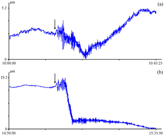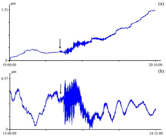 Fragment of a 52.5-m laser strainmeter record of 11 July 2014, Namie (a) and 18 June 2019, Tsuruoka (b). UTC time. The arrow indicates the moment of the beginning of the earthquake registration.