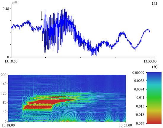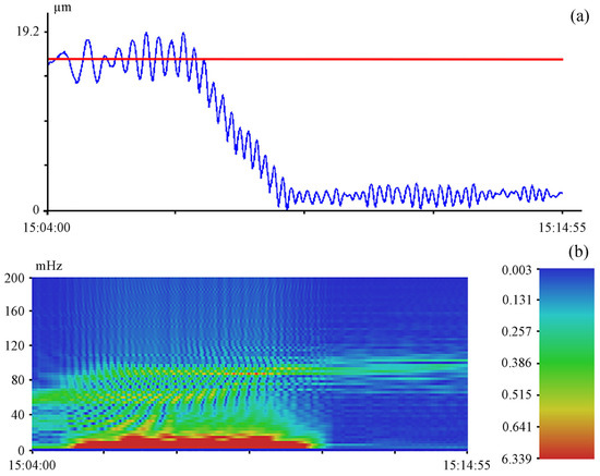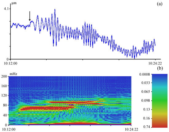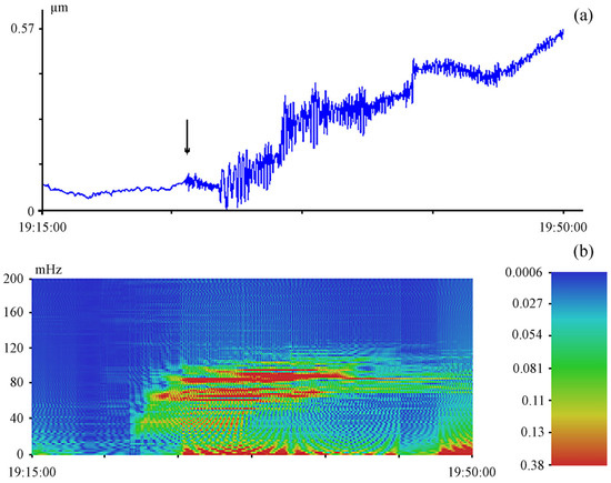As an example, let us consider the laser strainmeter records of two non-tsunamigenic earthquakes listed in Table 1. Figure 6 shows the laser strainmeter records of these earthquakes. As we can see in Figure 6, there is no deformation anomaly characteristic of a tsunamigenic earthquake. The 2014 earthquake happened 139 km from Namie at 37.005° N 142.453° E at 19:22:00 (UTC) on 11 July. The magnitude of the earthquake was 6.5, and its hypocenter was located at a depth of 20 km [24]. An enlarged fragment of the 2014 earthquake record and a dynamic spectrogram are shown in Figure 7. There is no deformation jump in Figure 7a. On the dynamic spectrogram in Figure 7b, there are oscillations with periods of 10 and 14 s. The absence of a deformation anomaly indicates that this earthquake is being non-tsunamigenic.