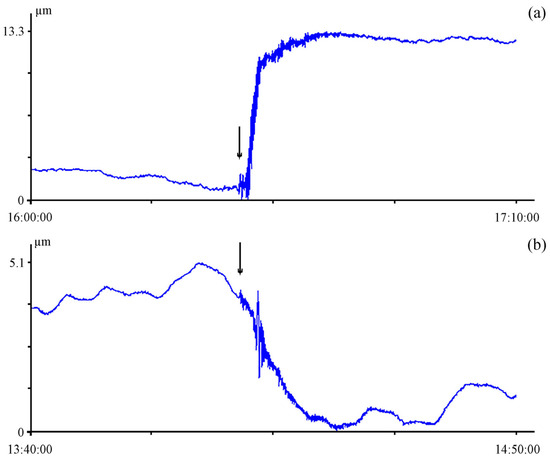 Fragment of a 52.5-m laser strainmeter record of 15 April 2016, Kumamoto (a), and 13 February 2021, Namie (b). UTC time. The arrow indicates the moment of the beginning of the earthquake registration.