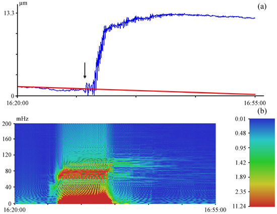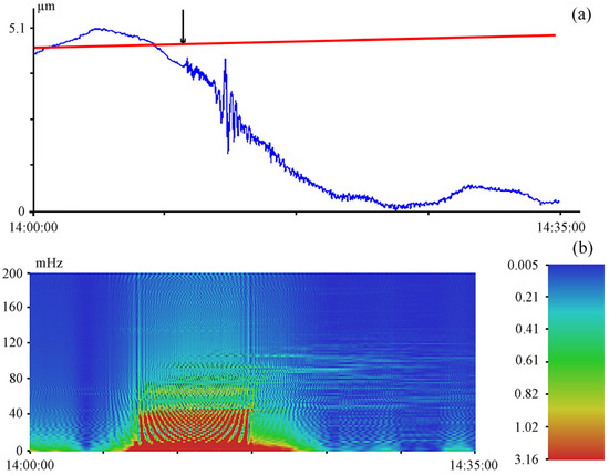 Fragment of a 52.5-m laser strainmeter record of 15 April 2016, Kumamoto (a) and dynamic spectrogram of this record (b). UTC time. The laser strainmeter record (blue), the trend line (red). The arrow indicates the moment of the beginning of the earthquake registration.