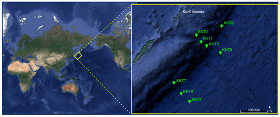 Map of Kuril–Kamchatka Trench with the indication of the sampling sites. Google Earth Pro version 7.3.6 was used to generate the map, which was graphically edited.
