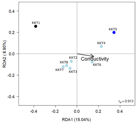 RDA biplot indicating the relationship between the samples (based on archaeal OTU profiles) and the conductivity. Variance explained by the two axes is shown in brackets. Samples are colored according to the sampling depth (cyan: 1000 m; blue: 1500 m; black: 2000 m). rM represents the Mantel correlation coefficient between the Hellinger distances (between samples) and the Euclidean distances (between the sample symbols in the biplot). Values close to 1 indicate that the plot properly lays out the distance between samples.