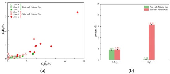 Composition diagram of Lower Paleozoic natural gas in the Ordos Basin. (a) Correlation diagram of ethane−propane content. (b) Diagram of natural gas acid−gas content.