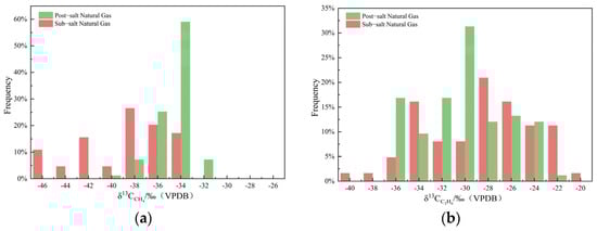 Methane–carbon and methane–hydrogen isotopic compositions are important parameters for determining the genesis and thermal evolution of natural gas [,]. It is generally inferred that the methane carbon isotope composition is mainly affected by the degree of thermal evolution of the hydrocarbon source rock, with a higher degree of thermal evolution equating to a heavier methane carbon isotope value. The ethane carbon isotope composition is strongly influenced by the original parent material; although it is also affected by the thermal evolution degree of the source rock, the effect is much smaller than the methane carbon isotope composition. Therefore, the ethane carbon isotope composition is often used as an effective index to distinguish coal-type gas from oil-type gas []. At present, domestic scholars mainly use −28‰ [] or −29‰ [] as the boundary value in China.