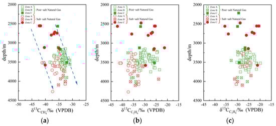Carbon isotope signature versus depth plots for different natural gas components in Ordos Basin Ordovician carbonate facies. (a) Relationship between methane carbon isotope characteristics and depth of natural gas. (b) Relationship between ethane carbon isotope characteristics and depth of natural gas. (c) Relationship between propane carbon isotope characteristics and depth of natural gas.