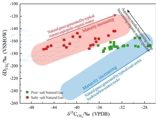 Wang et al. (2015) [] analyzed the carbon and hydrogen isotope compositions of methane in typical sedimentary basins in China and established an oil-type gas versus coal-type gas discrimination diagram. Their study showed that the hydrogen isotope compositions of natural gas components produced by hydrocarbon source rocks formed in freshwater environments are light, and conversely, those of natural gas components formed in saltwater environments are heavy. Their study also showed that natural gas methane carbon and hydrogen isotopes are positively correlated with increasing thermal maturity. In addition, the hydrogen isotope composition of typical marine humic natural gas is heavier than that of typical coal-type gas; the former is generally >−180‰, while the latter is only >−180‰ when the degree of thermal evolution is very high. The methane–hydrogen isotope composition of natural gas can be used to study the aqueous environment in which its parent material was deposited, enabling comparative natural gas–gas source rock studies []. The isotopic data from the natural gas samples in this study are plotted on a discrimination diagram (Figure 5), where they are plotted near the area of natural gas formed by marine humic organic matter, indicating an origin from Ordovician carbonate hydrocarbon source rocks. The “post-salt” natural gas samples were more dispersed between the coal-type and oil-type gas regions, showing mixed-source characteristics.