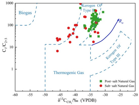 The combination of hydrocarbon fraction ratios and carbon isotope compositions can also be used to classify the type of natural gas genesis. The Bernard diagram has been used to identify the type of natural gas genesis on the basis of a large number of natural gas sample datapoints []. Using this diagram, the “post-salt” natural gas parent material in the study area can be classed as a mixture of type II and type III kerogen but dominated by type II kerogen; in contrast, most of the “sub-salt” natural gas samples plotted in the type II kerogen region, this being the oil-type gas region (Figure 6).