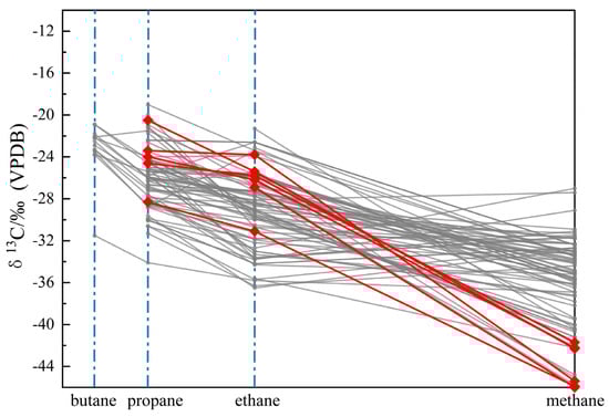 During the hydrocarbon evolution of sedimentary organic matter, there are kinetic fractionation and inheritance effects between natural gas components and parent carbon isotopes; lower carbon number hydrocarbons are more likely to be enriched in 12C, and higher carbon number hydrocarbons are more likely to be enriched in 13C. Thus, the carbon isotope composition of organogenic alkane gases tends to show the pattern δ13CCH4 < δ13CC2H6 < δ13CC3H8 [].