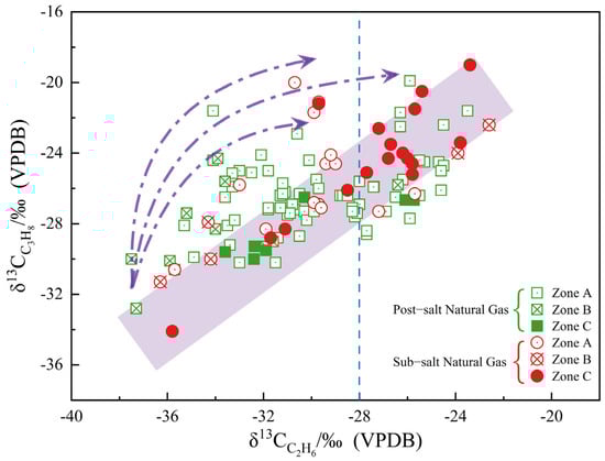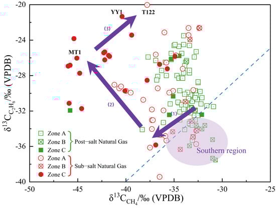 The methane δ13C signatures of the “sub-salt” natural gas were lighter than those of the “post-salt” natural gas; this is contrary to the normal evolutionary characteristics of homologous natural gas formation, reflecting the fact that they may have differences in source or secondary transformation. The ethane δ13C signatures of the “sub-salt” natural gas had a wider range and were partially lighter than those of the “post-salt” natural gas. This reflects the different sources of the gases, also demonstrating the uniqueness and complexity of the formation and evolution mechanism of the “sub-salt” natural gas (Figure 3).