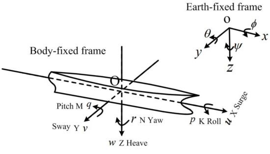 where a ship’s motion descriptions are surge, sway, heave, roll, pitch, and yaw, which is a ship’s 6 DOF motion. denotes the displacement of a ship in the x, y, and z directions, respectively, denotes the rotation angle around the x, y, and z axes, respectively, denotes the translational velocity in the x, y, and z directions, respectively, denotes the rotational velocity around the x, y, and z axes, respectively, and and denote the external force and moment [32].
