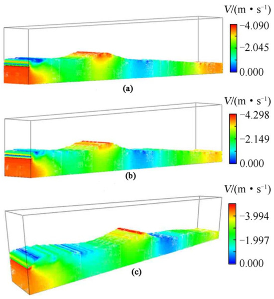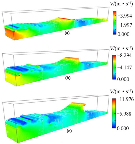 Wave contour of free surface for different speeds (t = 4.6 s). (a) 20 kts. (b) 30 kts. (c) 40 kts.