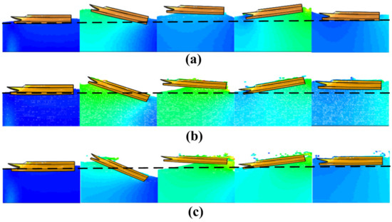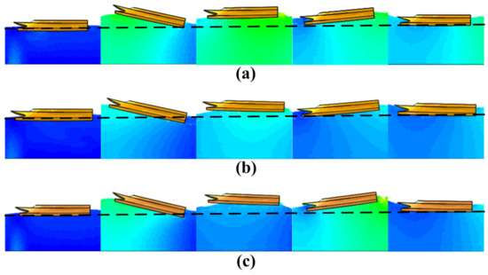 According to Section 2.4, when the suitable T-foil for the offshore wind power O&M vessel from the optimization design of T-foil’s location and its strut’s height is found, the optimal lift coefficient of T-foil will be obtained. Based on CFD simulation, the T-foil’s location can be preliminarily judged according to the vessel’s attitudes and its wetted area in the following figures [21].