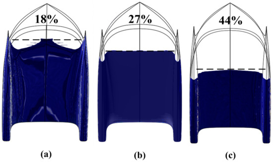The wetted area of the O&M vessel for different speeds (t = 4.6 s). (a) 20 kts. (b) 30 kts. (c) 40 kts.