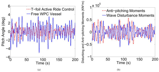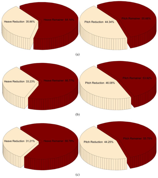 The responses of heave and pitch motion are obtained owing to the above building of ride control platform. Taking into account the damage caused by the vessel’s motion to passengers and freight [13], the pitch reduction is preferred in this paper. Figure 19 and Figure 20 show that the T-foil active ride control is feasible and effective at high sailing speed and high sea state for the O&M Vessel. Moreover, as can be shown, pitch reduction outperforms heave. The anti-heaving forces and pitch moments have a better compensation for wave-induced disturbing forces and moments.