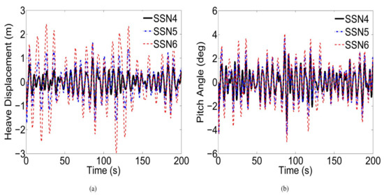 The heave and pitch motion responses at different sea states and speeds are shown in Figure 21 and Figure 22. It can be seen that with the increase of sea state, the amplitude of heave and pitch motion increases obviously. However, the increase of the speed does not have much effect on heave and pitch motion. Therefore, we can come to the conclusion that the change of sea state has a greater impact on ship motion compared with the change of speed.