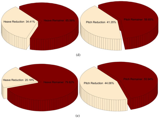 Heave and pitch reductions for the O&M vessel in different situations. (a) Reduction for SSN4, 20 kts. (b) Reduction for SSN5, 20 kts. (c) Reduction for SSN6, 20 kts. (d) Reduction for SSN6, 30 kts. (e) Reduction for SSN6, 40 kts.