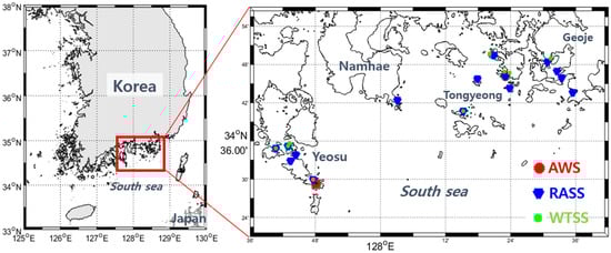 Installation stations of the automatic weather system (AWS), red tide acoustic sensing system (RASS), and water temperature sensing system (WTSS) in the South Sea of Korea (red circle: AWS; blue triangle: RASS; green circle: WTSS).