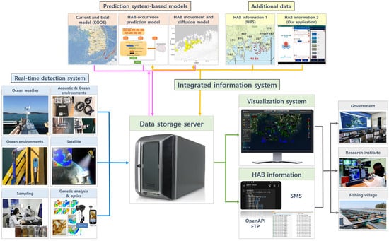 In this study, we developed an integrated system that combines various methods for HAB detection and prediction. One component of this system is the real-time HAB detection system, which incorporates ocean weather data, ocean parameters (such as water temperature, salinity, and Chl-a levels), satellite imagery, sampling, genetic analysis, and optical data. Another aspect involves prediction systems based on KOOS, HAB occurrence prediction, and HAB movement and diffusion models. Additionally, the system includes an integrated information system consisting of a data storage server, the FTP server, and the visualization system.