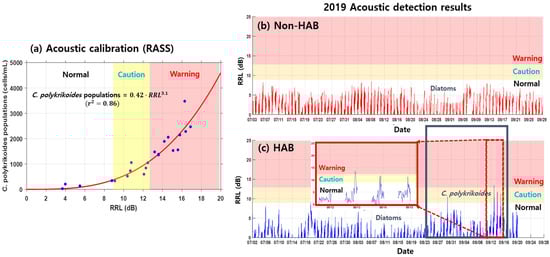 (a) Relatively received level (RRL) regression curve versus C. polykrikoides population. The results of the acoustic data of time series using the RASS; (b) non-HAB; and (c) HAB environments.