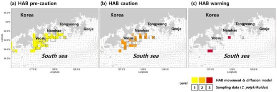 Accuracy evaluations from the HAB movement diffusion model (color boxes) and sampling data of C. polykrikoides (black number boxes) at: (a) 1 level (HAB pre-caution stage): 10–100 cells/mL; (b) 2 level (HAB caution stage): 100–1000 cells/mL; and (c) 3 level (HAB warning stage): more than 1000 cells/mL.