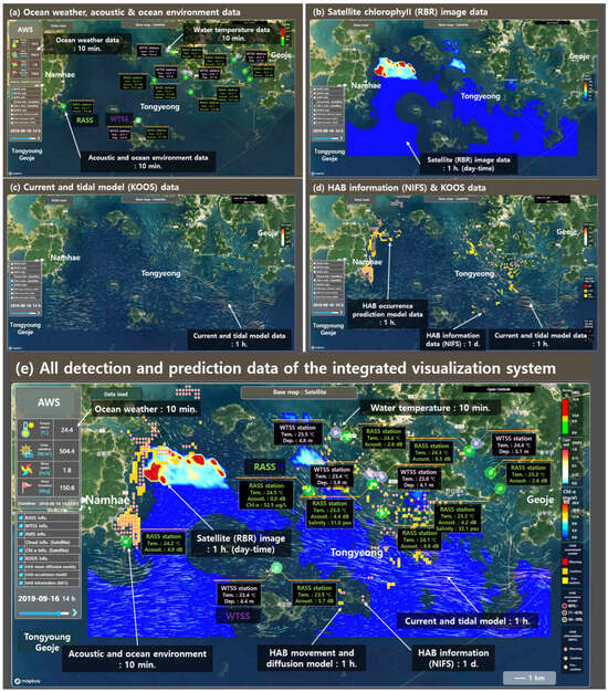 Examples of the visualization system at the Tongyoung and Geoje sites: (a) ocean weather, acoustic, and ocean environment data from AWS, RASS, and WTSS; (b) satellite chlorophyll (RBR) image data; (c) current and tidal model data; (d) HAB occurrence prediction model based on the HAB information (NIFS) data and the KOOS model data based on the geographic information system (GIS); and (e) all detection and prediction data of the integrated visualization.