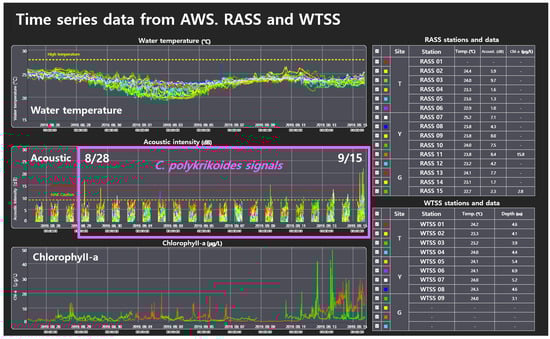 The water temperature, acoustic, and Chl-a data from measuring by RASS and WTSS are displayed as graphs for each station on the left-hand side of the fluctuation detection screen (Figure 7). Each entry of the real-time measurement data is displayed as a numerical value for each station in the table on the right. From August 28 to September 15, 2019, the signals caused by C. polykrikoides were detected via acoustic and Chl-a values at specific ocean sites. Thus, comprehensive HAB detection and prediction in real time is possible. The practicality and effectiveness of the system were confirmed by integrating various types of data and building a visualization system.