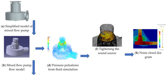 - Fu, J.; Wang, Y.; Jin, S. Numerical predicting method for hydroacoustics of mixed-flow pump. J. Cent. S. Univ. (Sci. Technol.) 2016, 47, 62–68. [Google Scholar]