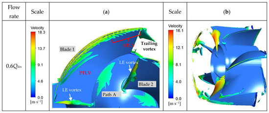 Characteristics of flow field in different flow conditions: (a) Q-criterion blade vortex diagram; (b) Q-criterion guide vane vortex diagram.
