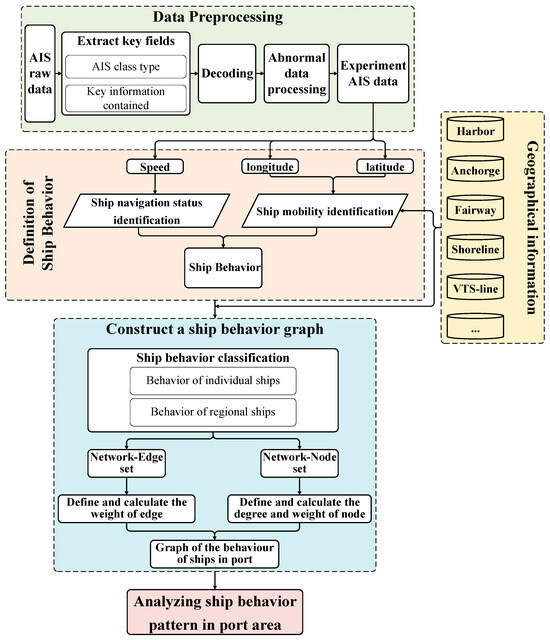 The whole process for the analysis of ship behavior patterns is shown in Figure 1. The main steps are as follows.(1) AIS data preprocessing: Decoding the AIS original data and eliminating abnormal data. (2) Digitization of geographical information: The geographical information of a port, including spatial location information such as port areas, anchorages, channels, berths, etc., has been formulated. (3) Distinguishing ship status: The status of the ship entering and leaving the port is analyzed based on matching ship positions and geographic information of the port. This status includes the position and time for the ship entering and leaving the port area, channel, anchorage, berth, etc. (4) Analyzing ship behavior pattern: The port can be represented as a complex network based on its functional areas, and the ship moves across the port areas. The similarity and spatiotemporal differences in ship behavior chains for various groups of ships are calculated to realize region-oriented ship behavior pattern modeling.