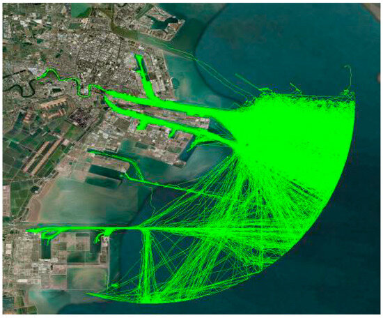 The visualization of ship trajectories in Tianjin Port in 2021 is presented in Figure 3. It illustrates the density and complexity of ship trajectories within port areas and can also reflect the busy traffic at Tianjin Port to a certain extent. However, a single trajectory cannot provide enough information to model ship behavior or analyze the differential impacts of factors such as busy traffic, environmental conditions, and crossing fairways on ship behavior.
