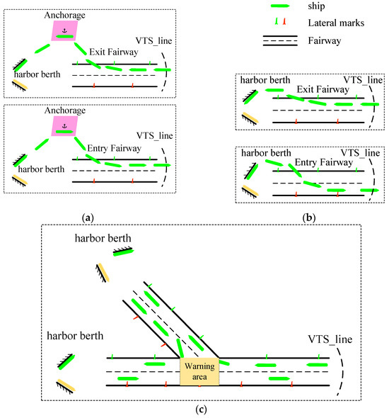 The behavior pattern of multiple ships in Tianjin Port; (a) Ships entering and leaving the port include anchoring at anchorage; (b) Ships enter and leave the port directly; (c) Ships passing through intersecting waters.