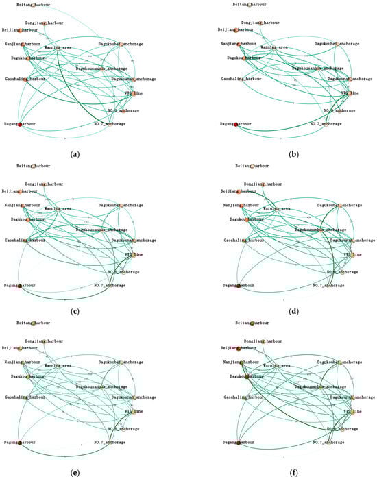 According to edge weights, the average sailing time and the total number of ships vary month-on-month. For instance, the edge connected with VTS and No. 7 Anchorage has a darker color in March than in April, suggesting that ships generally spent more sailing time between VTS and No. 7 Anchorage in March. The weights of the same node vary at different months. For instance, the color of the node representing Gaoshaling Harbor in May is lighter than in July, suggesting that ships spend a longer average staying time in July. The navigational behavior of ships in the Tian-jin Port is varied and complicated, as revealed by the characteristics of nodes and edges. For instance, the No. 7 Anchorage typically provides services for the ships with an arrival destination of the Dagang Harbor, but it is observed that only 17 ships anchored in February. The fairway Dagukou Bulk and No. 7 anchorages were used only by fifteen ships in October. It is obvious that there are occasional ship behaviors in addition to the typical frequent patterns.