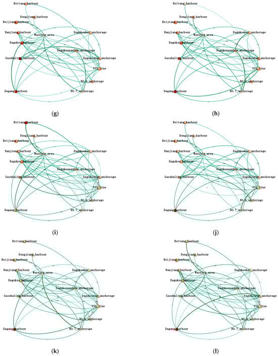 Network structures of Tianjin Port; Network structures in (a) January; (b) February; (c) March; (d) April; (e) May; (f) June; (g) July; (h) August; (i) September; (j) October; (k) November; (l) December.