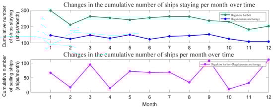 Correlation analysis. In general, the correlation between two nodes that are connected by an edge is stronger than the others. As shown in Figure 9, the connected Dagukou Harbor and Dagukounan Harbor have similar trends for the monthly cumulative number of staying ships, which implies that there is a certain correlation between the two nodes. The number of ships staying at these two nodes is similar to the trend of the number of ships at this adjacent edge. It should be noted that one node always connects multiple edges, which leads to subtle differences in the weights of two nodes and their connected edges. Specifically, if node v and node v’ satisfy the following equation, there is a correlation between them.