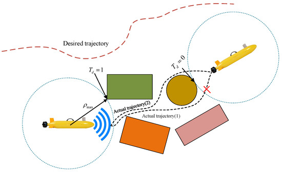 To realize omnidirectional detection centered on the UUV, a 360-degree scanning sonar was selected to obtain scanning data [27]. As shown in Figure 3, an obstacle is considered detected if its relative distance to the UUV is less than or equal to .