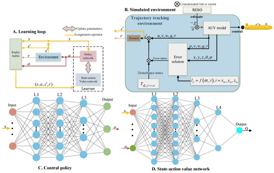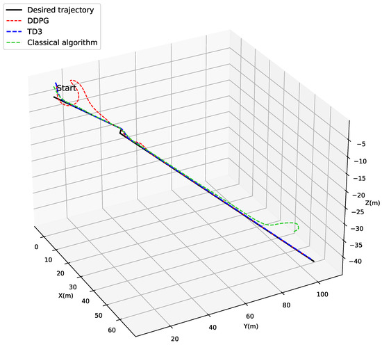 There have been numerous attempts at trajectory tracking with classical control methods. A fault-tolerant controller using feedback-linearized control to solve the consensus control problem for multi-UV systems was presented in [2]. Additionally, in [3], the target tracking control issue of underactuated UUVs was effectively tackled through the implementation of line-of-sight (LOS) and backstepping methods. In [4], a novel Lyapunov-based MPC framework was proposed to improve UUV tracking performance, and trajectory tracking control was explored using the model predictive control (MPC) approach. In order to attenuate the effect of the accuracy of the UUV mathematical model on the actual UUV control, many scholars have made improvements to the robustness and control algorithms of UUVs. In [5], an improved self-resistant (ADRC) control strategy was proposed, which estimated unknown disturbances by designing a generalized expanded state observer (ESO). Also, in terms of resistance to underwater disturbances, the motion control of an overactuated UUV based on dynamic sliding mode control (DSMC) theory was presented in [6] to improve the system robustness under the effects of the ocean current and model uncertainties. On this basis, in [7], an optimal allocation control (AC) algorithm was designed to maintain the linear position and Euler angles of the UUV in the presence of model uncertainties as well as ocean currents and to minimize the energy consumption of the system. To solve the UUV bottom-following control accuracy problem, in [8], a model-free controller based on a fuzzy approximator was provided, which significantly improved the robustness and control accuracy. Although the proposals in [4,8] had significant advantages in terms of control accuracy, their handling of external perturbations was poorly considered in comparison to the solutions in [5,7], resulting in possible poor adaptation to real environments. In contrast to the traditional methods described above, reinforcement learning learns directly by interacting with the environment, and the control accuracy does not depend on the accuracy of the model [9,10].