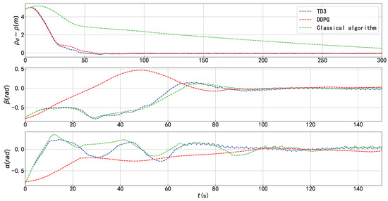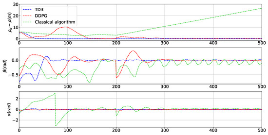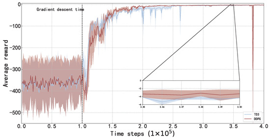 The training process is illustrated by Figure 7, where the average reward was calculated by evaluating the learned action strategy every 100 time steps, such that in each episode we evaluated the action strategy 10 times and finally calculated the average reward for each episode. In Figure 7, the top and bottom of the shaded area indicate the maximum and minimum of the average reward over the 10 assessments, respectively. The end of the 100th episode was taken as the dividing line, before which the process of data collection for the stochastic control strategy was carried out, and after which the action strategy started to be optimized iteratively by gradient descent until the optimal control strategy was obtained. The entire training process took 8.3 h on a computer with a CPU (Inter(R) Core(TM) i5-12400h @2.5GHz made in Portland, OR, United States) and a GPU (NVIDIA GeForce GTX 3070ti 8GB made in Santa Clara, CA, United States). Comparing the deep reinforcement learning algorithms, it is easy to see that the TD3 algorithm rewarded faster convergence and better training stability than the DDPG algorithm (the DDPG algorithm showed individually larger fluctuations near the end of training).