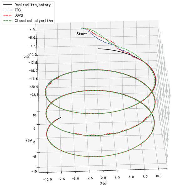 The parameter settings for the deep reinforcement learning algorithm were consistent before the simulation began. As shown in Table 1, for the 3D trajectory tracking task, we set the capacity of replay memory B to 100,000 and the batch size to 128. The learning rate was then set to 0.0003. Next, we selected the desired trajectory for model training as follows: