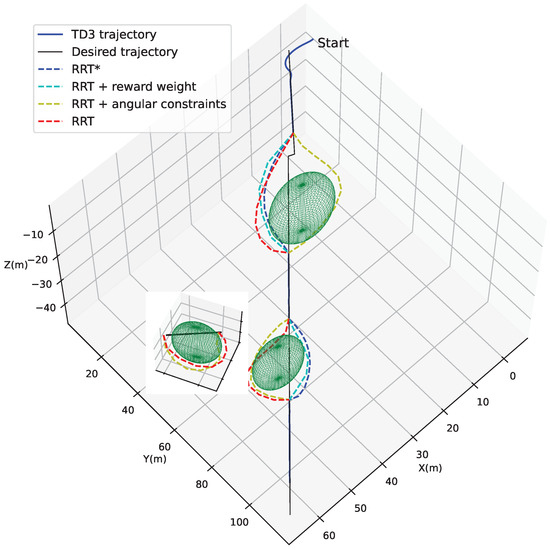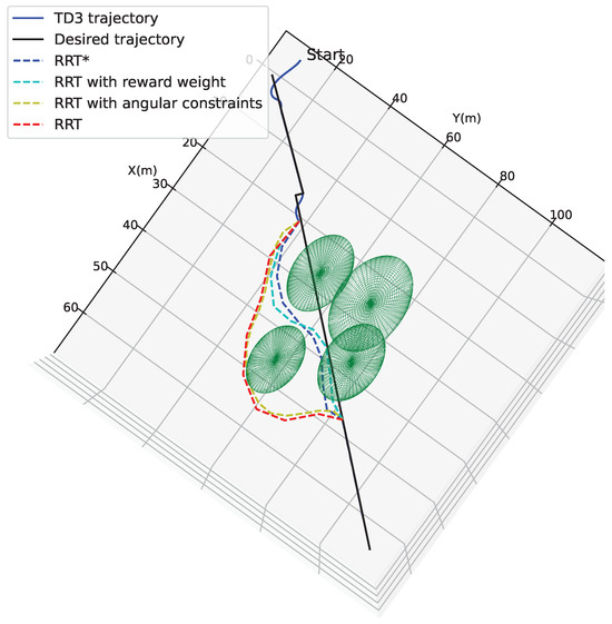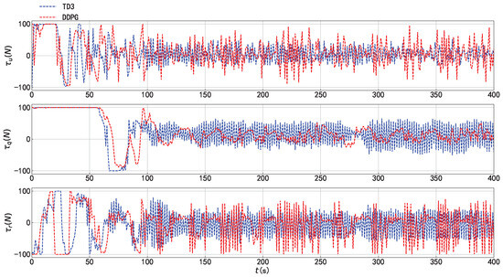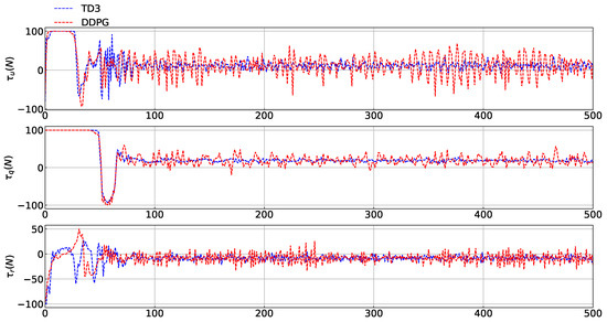 For the desired trajectory described in Equation (36), the tracking results of the three algorithms (TD3, DDPG, and the classical algorithm) are represented in Figure 14, Figure 15 and Figure 16 and were basically the same as the results in Section 4.1. However, the classical algorithm deviated at about the 210th time step and moved away from the desired trajectory. The TD3 algorithm outperformed the DDPG algorithm in terms of tracking speed, tracking stability, and the magnitude of the output force and moment. In order to fully test the performance of the UUV in the joint task of trajectory tracking and local planning, we established continuous obstacle avoidance and complex obstacle environments, respectively, on the basis of the above tracking trajectories, and the experimental results are analyzed below.