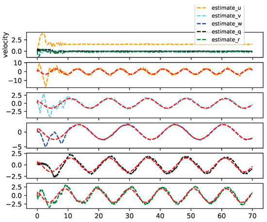 The results of the test are shown in Figure 8, Figure 9, Figure 10 and Figure 11. For comparison with the classical control methods mentioned in Section 1, we reproduced the trajectory tracking controller based on the LOS method in [3]. Additionally, in the context of deep reinforcement learning, in order to verify the convergence and stability performance of the TD3 algorithm in this task, the DDPG algorithm was used as the benchmark algorithm in the same task environment for comparison. In Figure 8 and Figure 9, it is clear that the TD3 algorithm approached the desired trajectory faster and demonstrated better convergence performance and less fluctuation relative to the classical and DDPG algorithms. The problem with the classical algorithms was that they showed poor convergence performance and took a long time to track the target, while the DDPG algorithm, although equal to the TD3 algorithm in terms of tracking speed, had poor stability. In addition, we show the compensated action output values in Figure 10. The DDPG algorithm presented a large-amplitude action output, which would cause dysfunction in the UUV propulsion structure. The estimations of the designed reduced-order extended state observer are shown in Figure 11: the first graph shows the velocity estimates for the UUV with five degrees of freedom, subsequent graphs show the estimates of the combined perturbation and additive fault terms under the five degrees of freedom condition, where the red dashed lines all indicate actual values. It is easy to see that the observer quickly converged to the target value after a short period of oscillation.